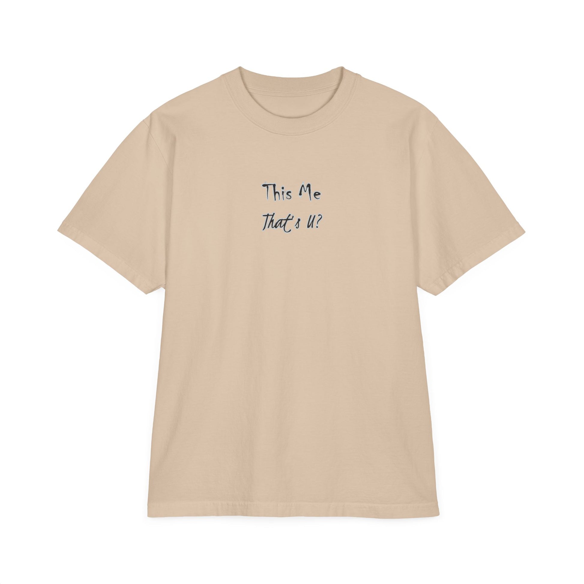 This Me That's U Tee Shirt is a gender-neutral garment-dyed drop-shoulder T-shirt made of 100% cotton with a vintage-washed color. Perfect for those looking for a relaxed and comfortable fit with reinforced stitching and a soft texture. Ideal for casual wear and can be worn by anyone seeking a laid-back style.